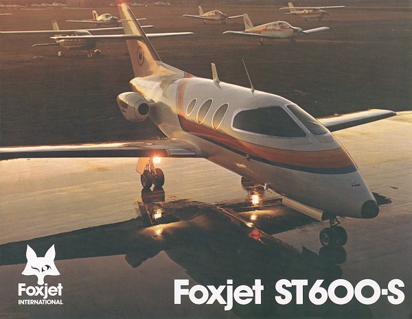 FOXJET F600 (From an old copy of Jane's, but edited with more information). The prototype of this lightweight twin-turbofan transport was expected to fly in 1980 but never did. Firm orders for 73 aircraft, backed by deposits, were in hand in mid-1978, and Foxjet International envisaged eventual manufacture of 44 Foxjet F600s per month. Engine development was then expected to uprate the present turbofan to 5.35 kN (1,200 lb st, with a subsequent refanned version rated at 6.24 kN (1,400 lb st). NOTE: Thrust mentionned above is total thrust for both engines. TYPE: Four/six-seat twin-turbofan transport. Wings: Cantilever low-wing monoplane. NACA 65 Series laminar flow section. Moderate leading-edge sweepback; straight trailing edge. All-metal fail-safe structure, primarily of light alloy. Electrically operated modified Fowler type single-slotted light alloy trailing-edge flaps. Manually operated ailerons. Hydraulically operated spoilers, forward of flaps, serve also as airbrakes. Trim tab in port aileron. Electrical anti-icing of each wing leading edge at root, optional pneumatic de-icing boots for remainder of leading edges. The Foxjet wing had been designed for the Foxjet by Branson Aircraft Corporation. Known as the Foxjet Super-Flow wing, this could be modified easily to supercritical form when required by future power increase, and was claimed to improve stability and low-speed control. Performance was generally improved by these changes. Fuselage: Semi-monocoque light alloy fail-safe structure of circular cross-section. Light alloy honeycomb pressure bulkheads and baggage deck. Tail - Unit: Cantilever multi-spar light alloy structure with swept vertical and horizontal surfaces. Variable-incidence tailplane mounted approximately midway up fin. Manually operated control surfaces, with tab in rudder, Leading edges fitted with de-icing system. Landing Gear: HydraulicaIly -retractable tricycle type, manufactured by Wiebel Tool Company, with twin wheels on each unit. Main units retract inward, nose unit aft. Manually operated emergency hydraulic system. Oleo-pneumatic shock absorbers. Main wheels have low-pressure tires size 5.00-5. Hydraulically steerable nosewheel unit, with water-chine tire size 11 x 4.00-5. Hydraulic disc brakes on main wheels. Power Plant: Two 3.78 kN (850 lb st) Williams Research WR44-800 turbofan engines, pod-mounted one each side of rear fuselage. Integral wing fuel tanks, total capacity 825 liters (218 US gallons). Engine inlet anti-icing system.