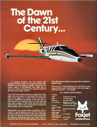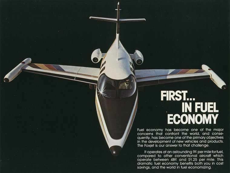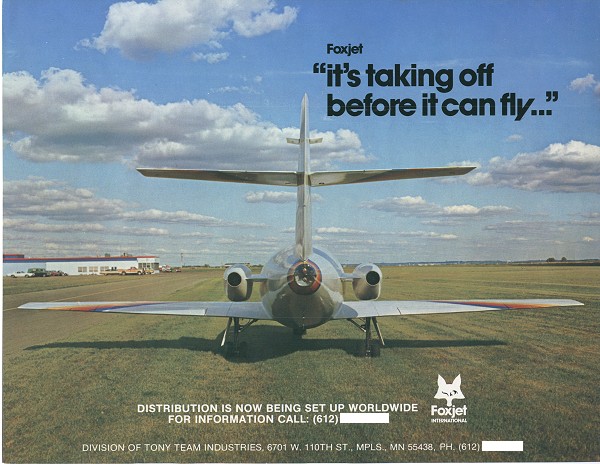 F O X J E T The Foxjet 600 was unveiled in 1977, and did not proceed beyond the manufacturing of several marketing mockups and a few parts. The concept itself was very good, but the program failed for lack of "reality check" tools available to Tony Fox. The aircraft startup environment is unforgiving when the unique challenges are not properly identified. Lack of financing or - as a Foxjet assets sales document implies - lack of powerplant availability, were more a result of these shortcomings rather than a cause. Many thanks to those who were involved directly or indirectly in this program and have provided me with unique material. |