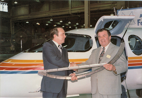 Donald Bordlemay, president of Aeronca, Tony Fox and Sam Williams sign a production deal on the FoxJet.