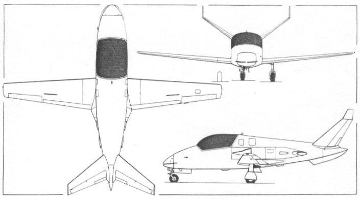 The Microjet prototypes were powered by two Microturbo TRS-18-1, each rated at 293 lbst, uprated automatically to 326 lbst if the other engine should fail during take-off. The production aircraft was to be powered by the TRS-18-2 rated at 405 lbst. The structure was a classic semi-monocoque, gear was retractable (electrical actuators), cockpit unpressurized, seats staggered by 22in, avionics was IFR and included the military extras such as UHF, TACAN and IFF. The small vertical fins on the tail were added in 1989 to address spin recovery issues. Poor performance due to inadequate powerplant made the aircraft inappropriate for its intended market.