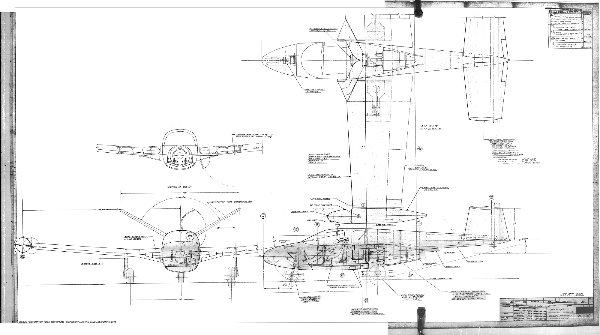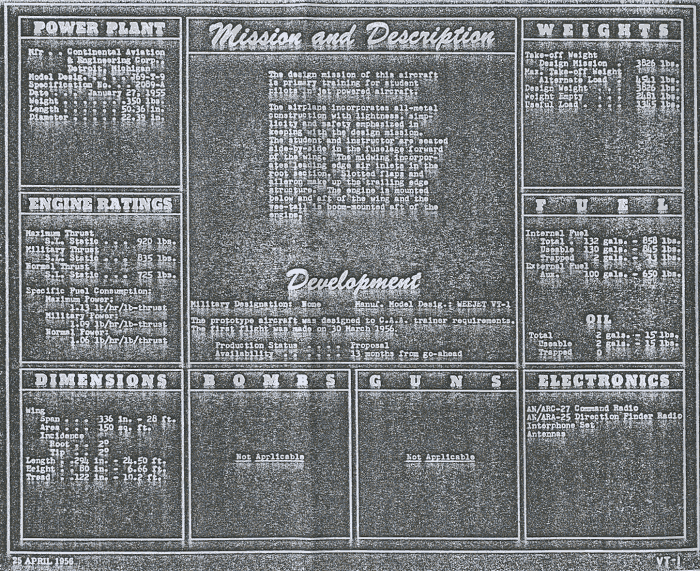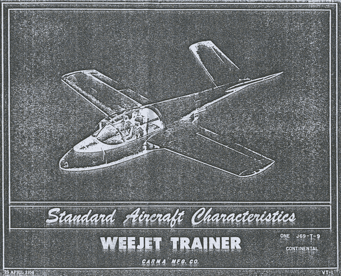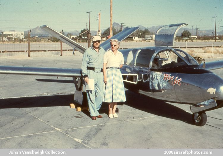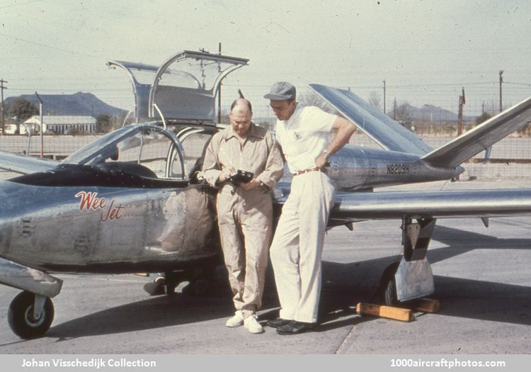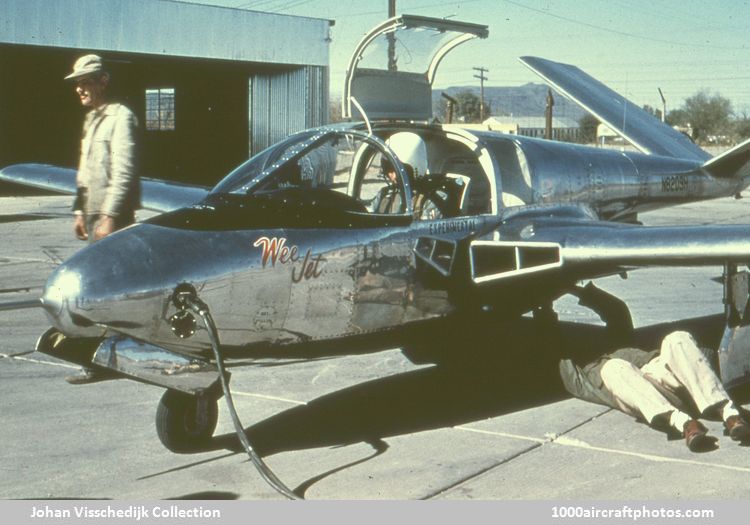 WEE JET Toutes les informations sur cette page sont issues des archives de Johan Visschedijk. Le Wee Jet est la création de Harold and Eleanor Dale, qui voulaient dessiner eux même l'avion "idéal". Harold était concepteur d'avion de métier, et il a dessiné le Wee Jet à ses temps libres alors qu'il était chargé de projets chez North American Aviation sur le F-100. Eleanor, avec un bon bagage mathématique et un certain sens des affaires, l'a assisté dans ce projet. Leur avion "idéal" avec de bonnes caractéristiques en vol lent, mais il devait être capable de voler à plus de 450 km/h. Il voulaient aussi être assis en avant de l'aile, ce qui favorisa le choix d'une propulsion par réacteur. La disponibilité d'un petit réacteur de 880 livres de poussée offert par Turboméca rendra ce projet réalisable. Le premier vol du Wee Jet a eu lieu le 30 mars 1956. C'est le seul exemplaire construit.